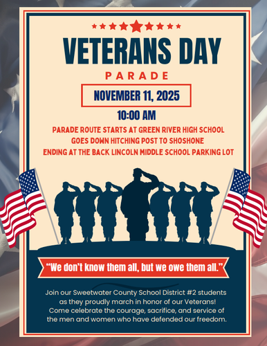 Join our Sweetwater County School District #2 students as they proudly march in honor of our Veterans! Come celebrate the courage, sacrifice, and service of the men and women who have defended our freedom.
